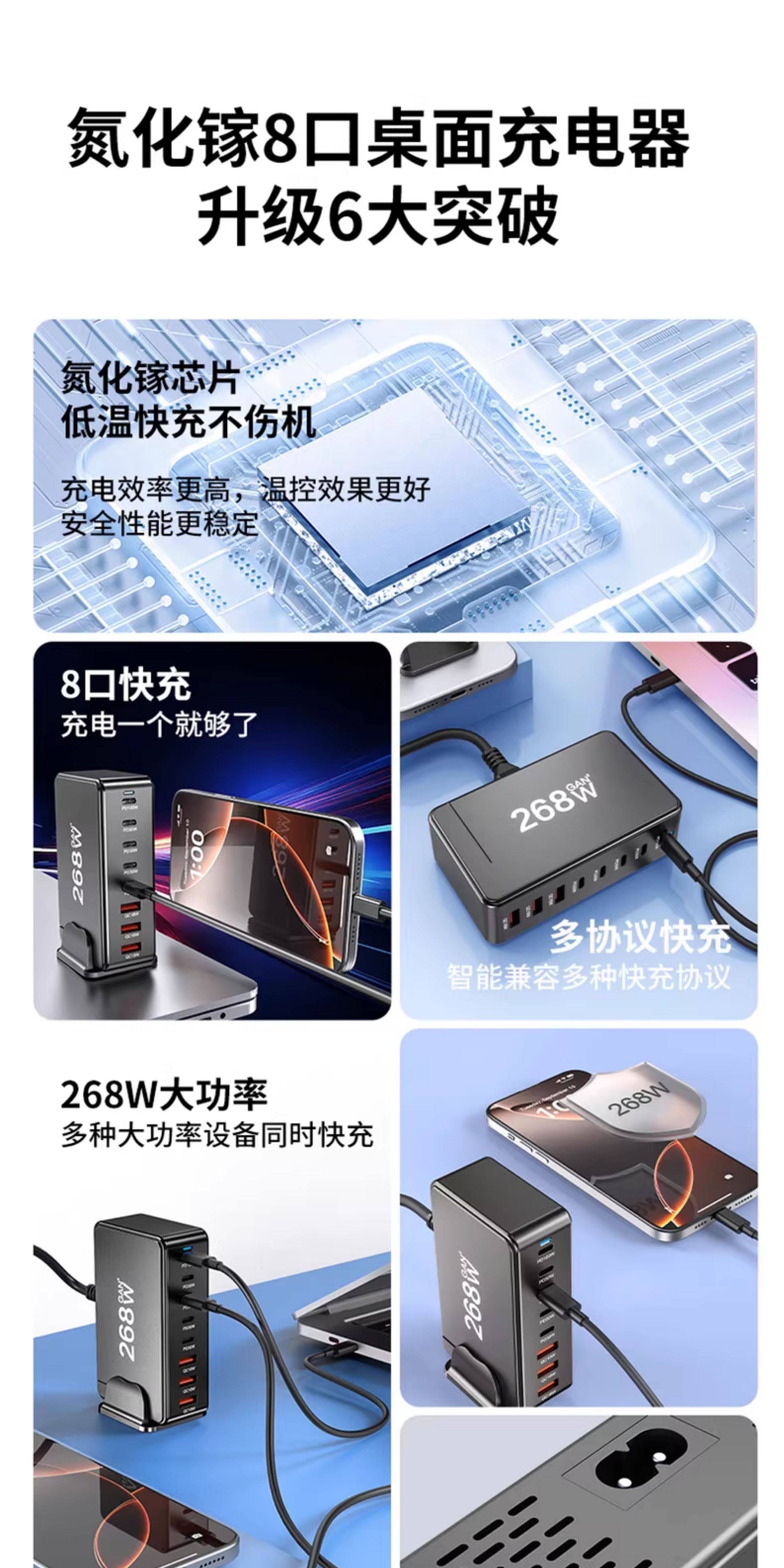 桌面充电站多口usb充电器TypeC插座多孔插头PD快充268W闪充手...