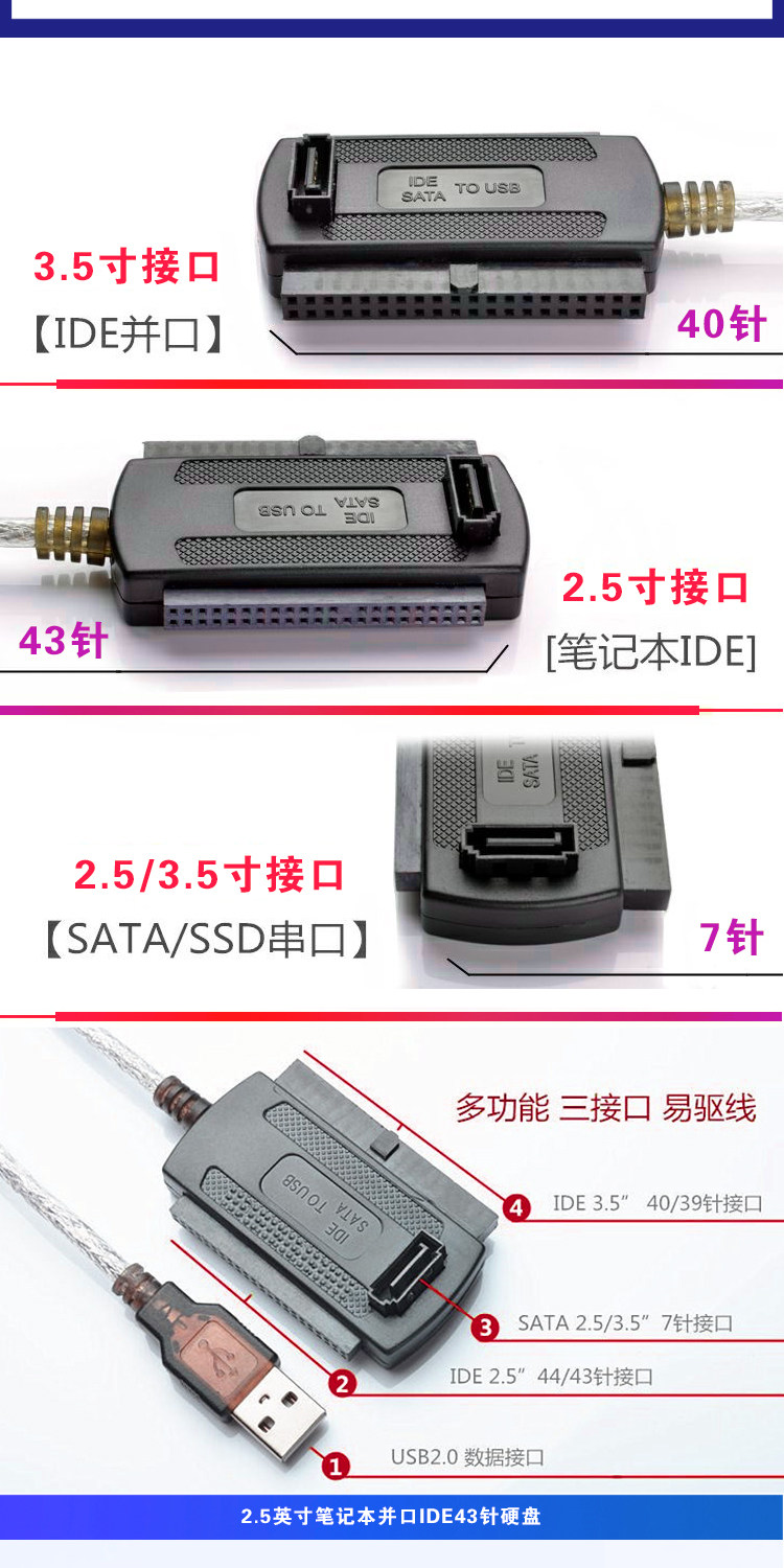 USB转IDE硬盘 USB转SATA转换转接器串口并口光驱易驱线外接带电源